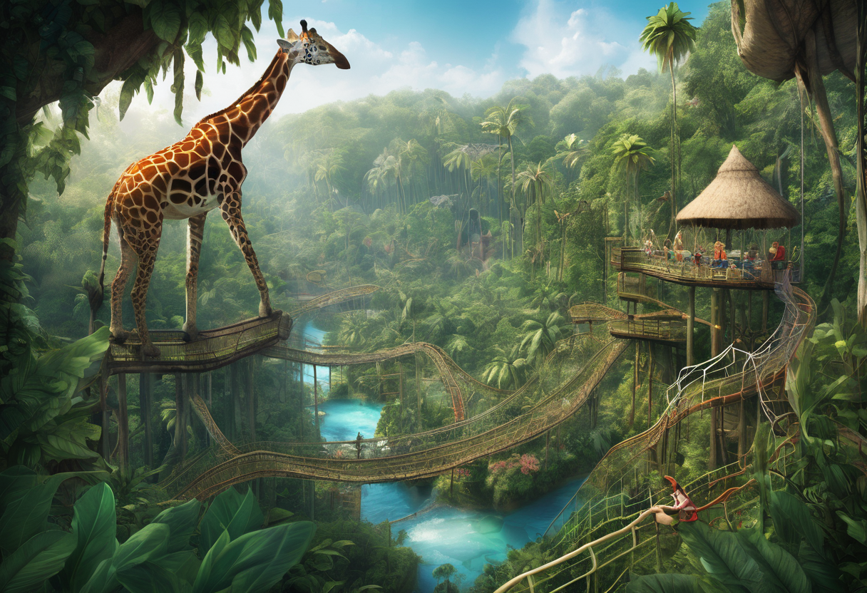 Welcome to Jungle Adventure Park, a paradise for nature lovers and adventurers alike. As you step foot into this lush green jungle, you are greeted by a symphony of sounds from various species of birds and monkeys. The air is filled with the sweet fragrance of exotic flowers and the earthy aroma of the forest floor. The sun filters through the dense canopy, illuminating the vibrant colors of the flora and fauna that call this place their home. The diversity of plant life is astounding, from towering trees to delicate ferns, each one with its unique characteristics and purpose.